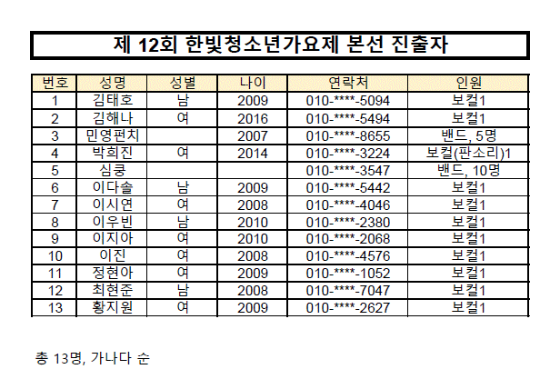 제 12회 한빛청소년가요제 본선 진출자 명단 공지